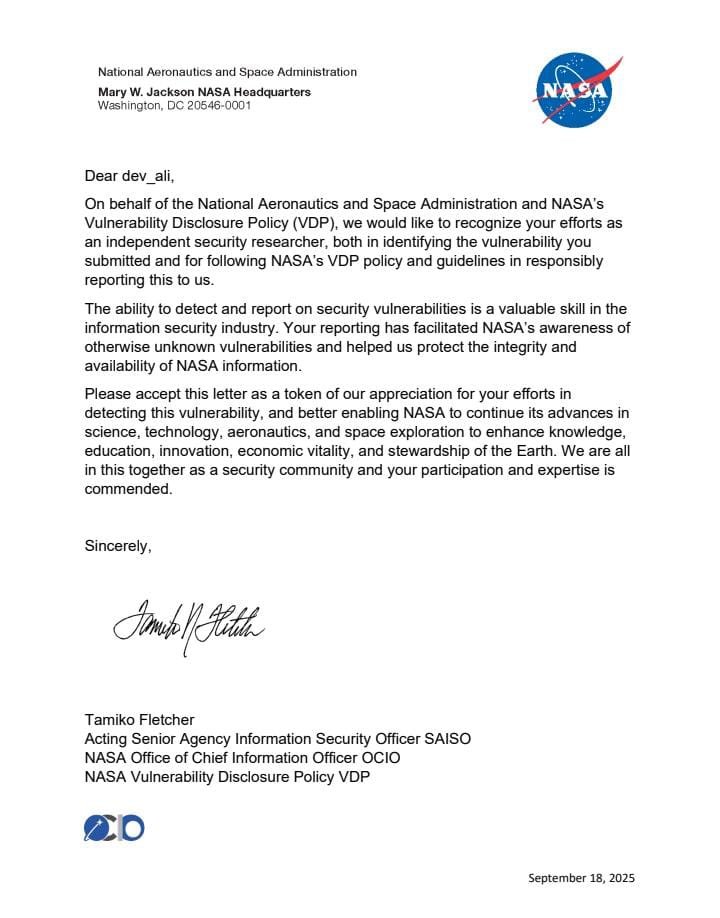 Few cybersecurity professionals can claim to have interacted with the digital ecosystem of NASA, the U.S. Space Agency. Ali discovered and responsibly reported a vulnerability in NASA’s systems, a feat that not only earned him recognition but also contributed to protecting the digital infrastructure of an organization at the heart of global space exploration. His intervention ensured that critical research, missions, and data remained protected from potential cyber intrusions.
